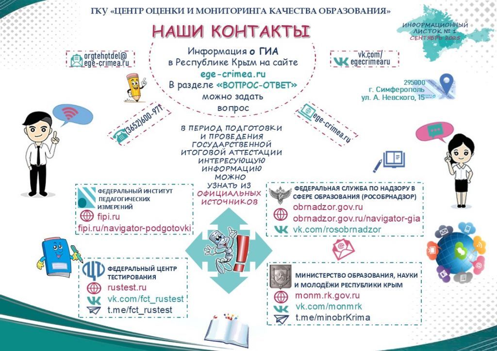 Информируем, что актуальная информация о ГИА размещена на официальном сайте Рособрнадзора (https:obrnadzor.gov.ru) и в официальном телеграмм-канале (https://t.me/rosobrnadzor_official). Кроме того, действуют телефон «горячей линии» Рособрнадзора по вопросам ЕГЭ (+7 (495) 198-92-38) и телефон доверия ЕГЭ (+7 (495) 198-93-38). Также действует телефон доверия по вопросам проведения ЕГЭ (на период проведения ЕГЭ) Министерства: +7 (3652) 273-118.