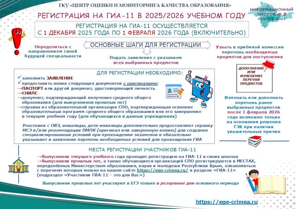 Регистрация на ГИА-11 осуществляется с 01 декабря 2025 года по 01 февраля 2026 года (включительно).